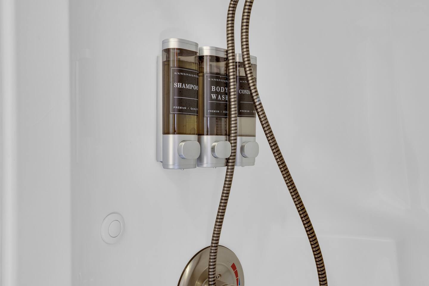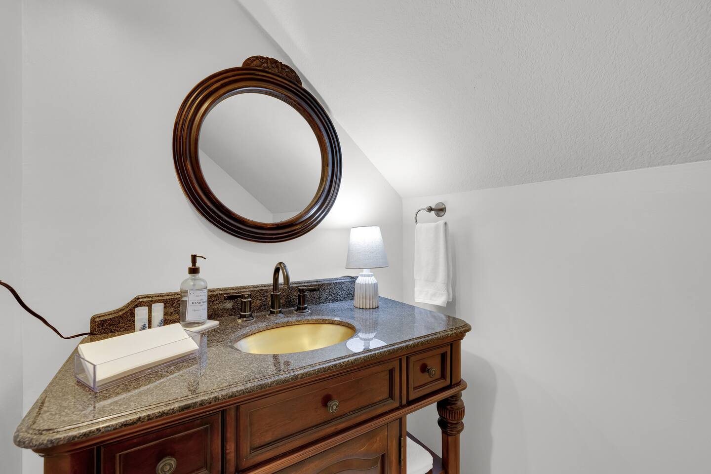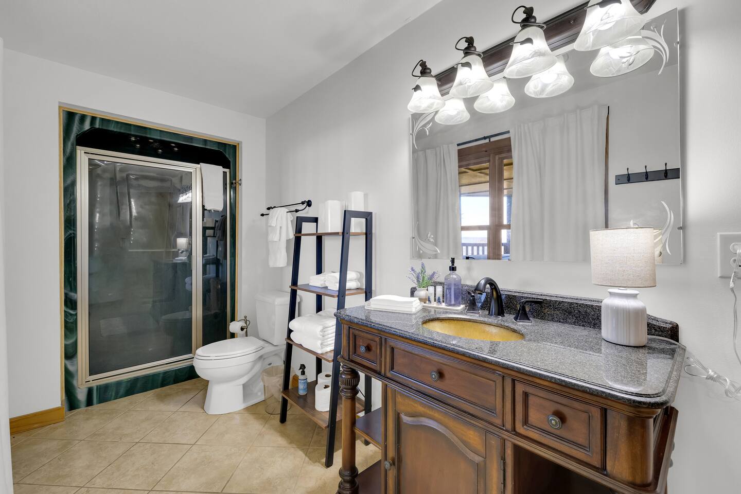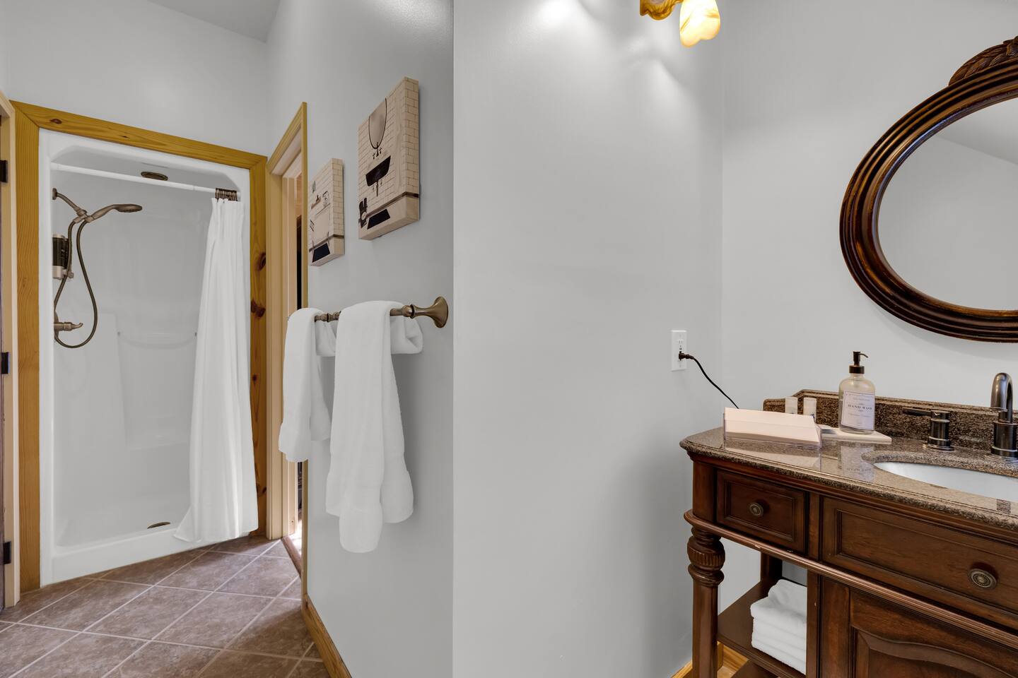 Main level: Master - King bed, private full bath bathroom. Upstairs: Bedroom 1 - queen - off room shower bathroom Bedroom 2 - 2 bunk beds,( twin over full) and 2 twins, (6 total beds) - shared bathroom from hall. Downstairs: Bedroom 1 - king - private stand-up shower bathroom. Bedroom 2 - queen - jack n jill bathroom with bedroom 3, tub shower combo. Bedroom 3 - queen.